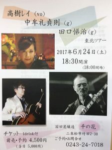 2017-6-24(土) 二本松【 千の花 】 2017 関東 – 東北ツアー! 中牟礼貞則(gui) 田口悌治(gui) Stage 19:00~ ・福島県二本松市竹田2丁目30 国田屋醸造 TEL 0243-22-0108 この名ツインギターとのツアーはもう3回目。 極上なツインギターと歌のコラボ世界をお楽しみください!