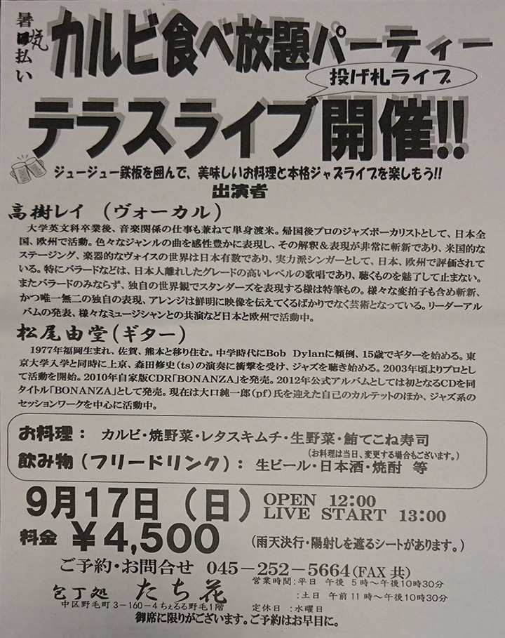 2017-9-17(日) 横浜野毛【 包丁処 たち花 】 テラス開催・スペシャルライブ! 松尾由堂(gui) Open 12:00 会費 ¥4,500 ・横浜市中区野毛町3-160-4 ちぇるる野毛 TEL 045-252-5664